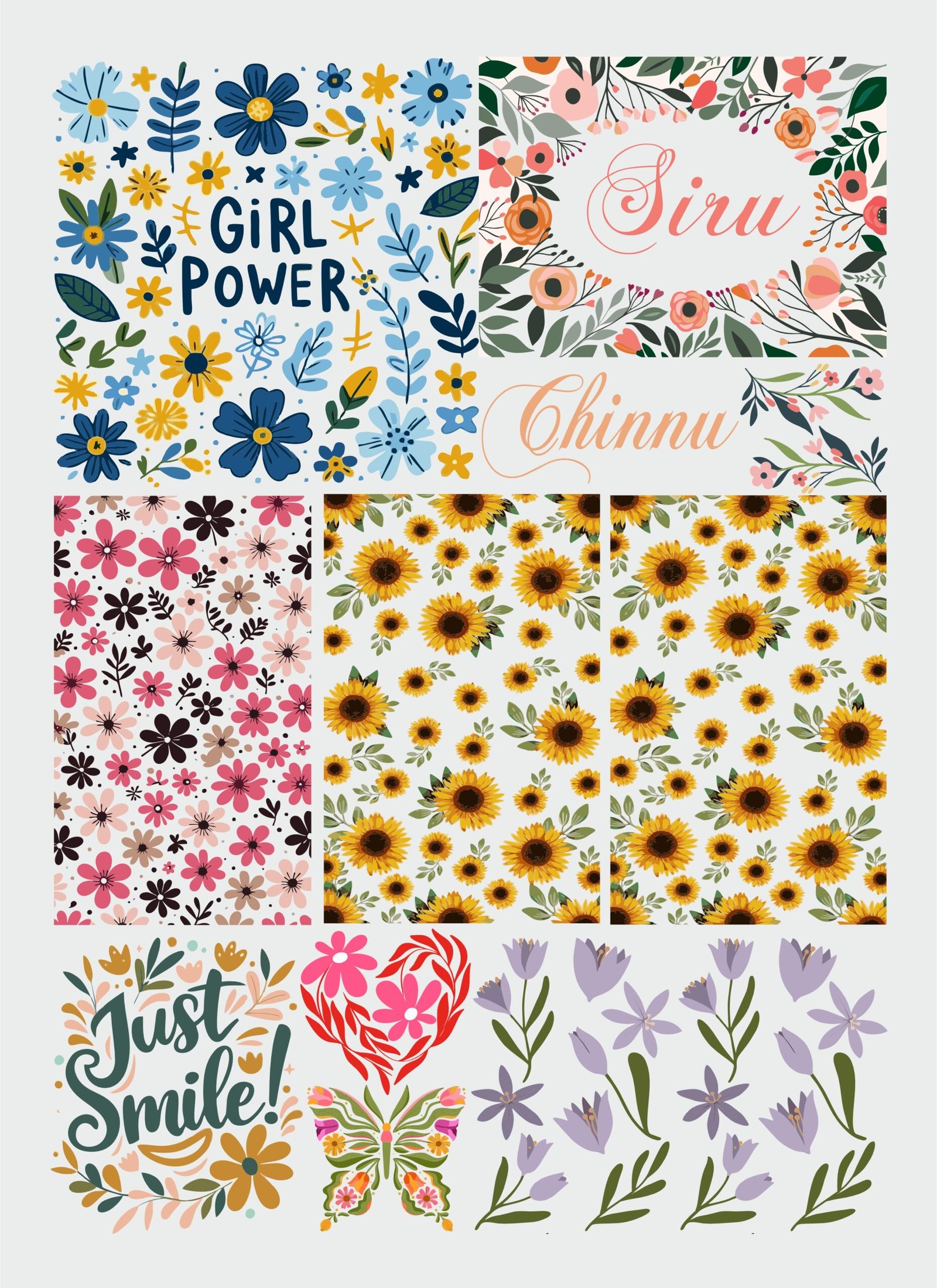 This floral decorative sticker sheet is designed for creative decoration and everyday personal use. The sheet includes colourful floral patterns, sunflower designs, leafy elements, butterflies, and word-based stickers such as Girl Power, Just Smile, and name-style decorative text. The overall look is bright, elegant, and suitable for modern stationery and craft use.