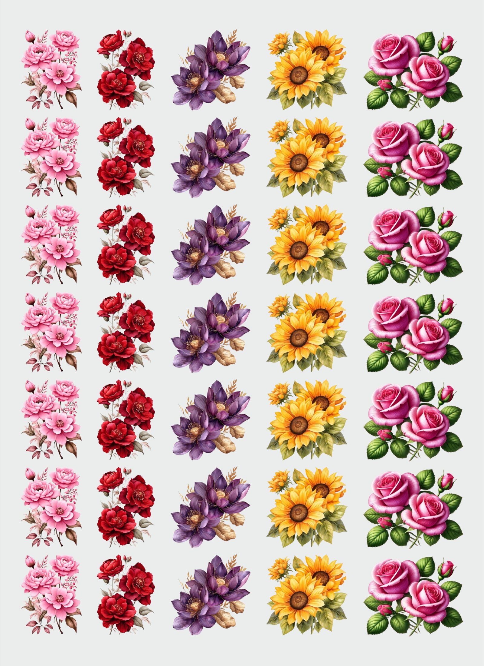 This mixed flower sticker sheet is designed for versatile decorative use. The sheet includes repeated floral designs such as pink roses, red roses, purple flower bouquets, yellow sunflower-style flowers, and green leafy accents. Each design is clearly printed and evenly spaced, allowing easy peeling and clean application.